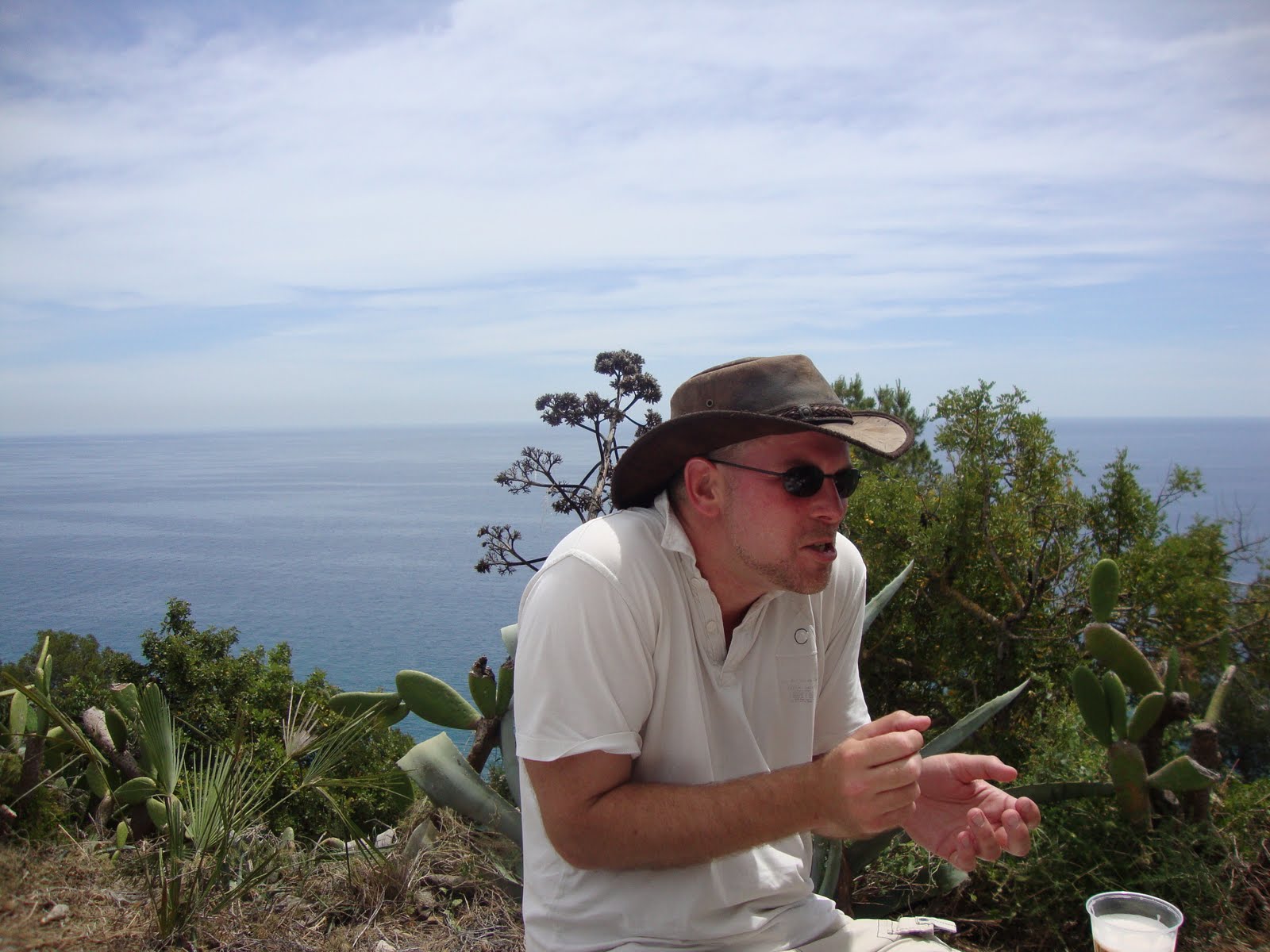 Undeterred by the absence of anything to cook on, we proceded to light the charcoal and improvised a grill with two large sticks - that as until Matti came up with a better idea and sharpened a stick to act as a skewer. The meal was wondeful, beef tomatoes to start with and then the botifarra with bread and salad - simple food under a hot sun with great views over the sea. This was a day to remember!